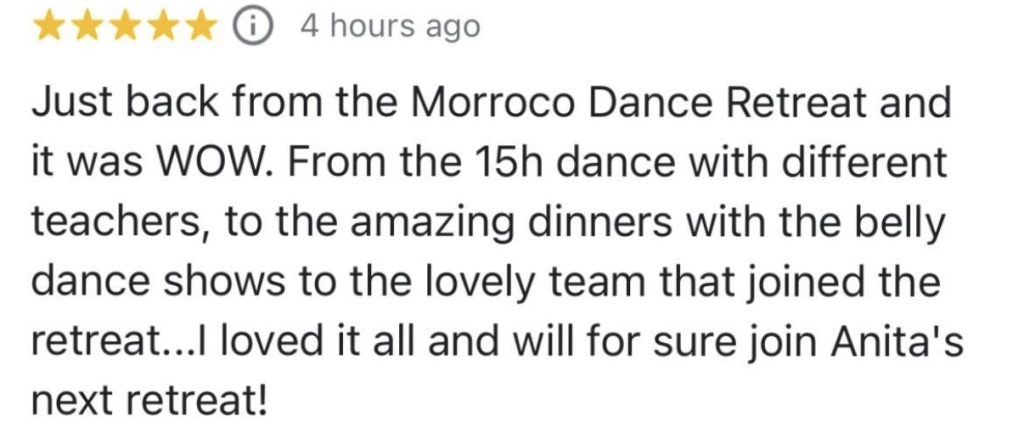 - Three full days of DANCE CLASSES (of 15 hours across 3 days – 11th, 12th & 13th September) throughout the stay at Art Academy, including a class with the founder of Art Academy who runs shows and events all over Morocco and has worked with creative artists world-wide.